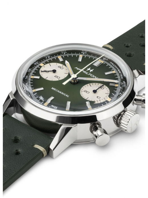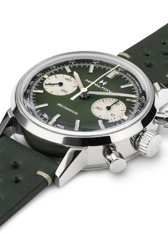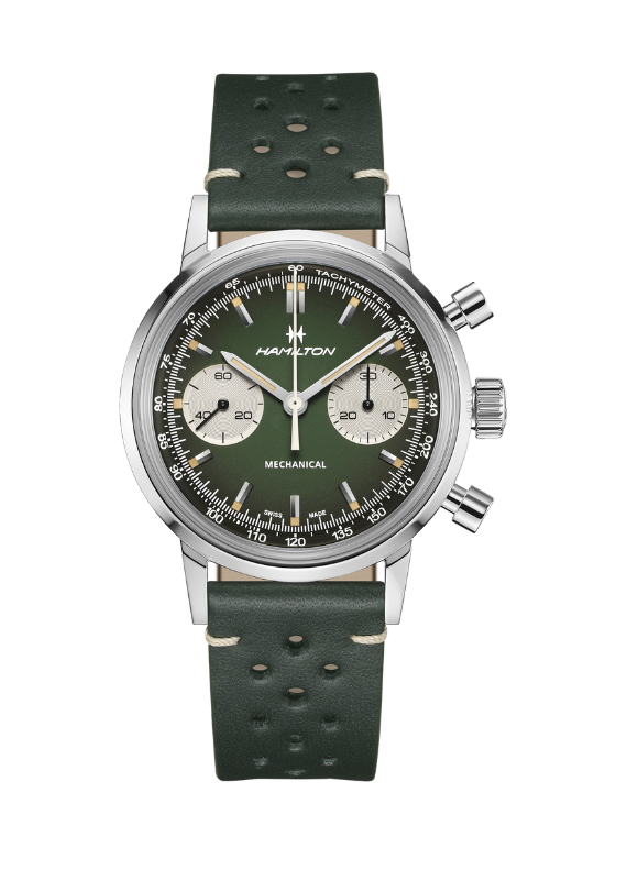 L'American Classic Chronograph da 40 mm declinato in verde bosco reinterpreta il fascino delle gare d’epoca attraverso un’ottica moderna. Il quadrante, impreziosito da una sfumatura fumé, acquista un carattere tridimensionale che ben si sposa con il cinturino traforato ispirato alla tradizione automobilistica. Grazie all’aggiunta di un bracciale in maglia intercambiabile incluso nel set, questo segnatempo automatico celebra l’eredità innovativa di Hamilton con un’estetica dinamica e grintosa.