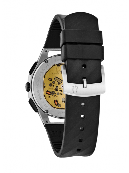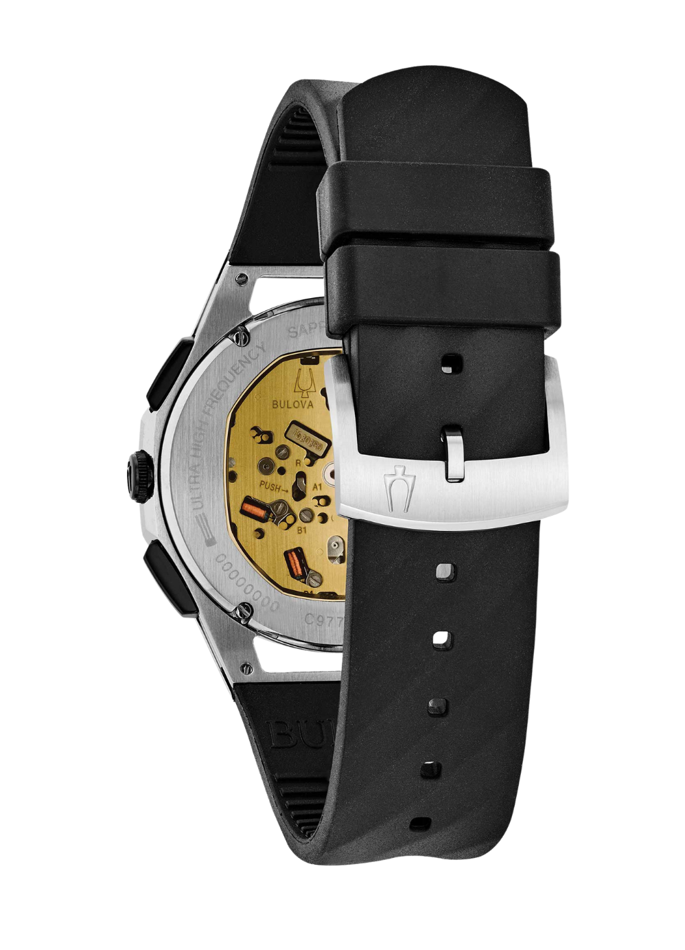 Al suo cuore batte il movimento Curv ad alta frequenza (262 kHz) per una precisione eccezionale, visibile attraverso il fondello a oblò. Il design sportivo è completato da un confortevole cinturino in caucciù nero con fibbia ad ardiglione.