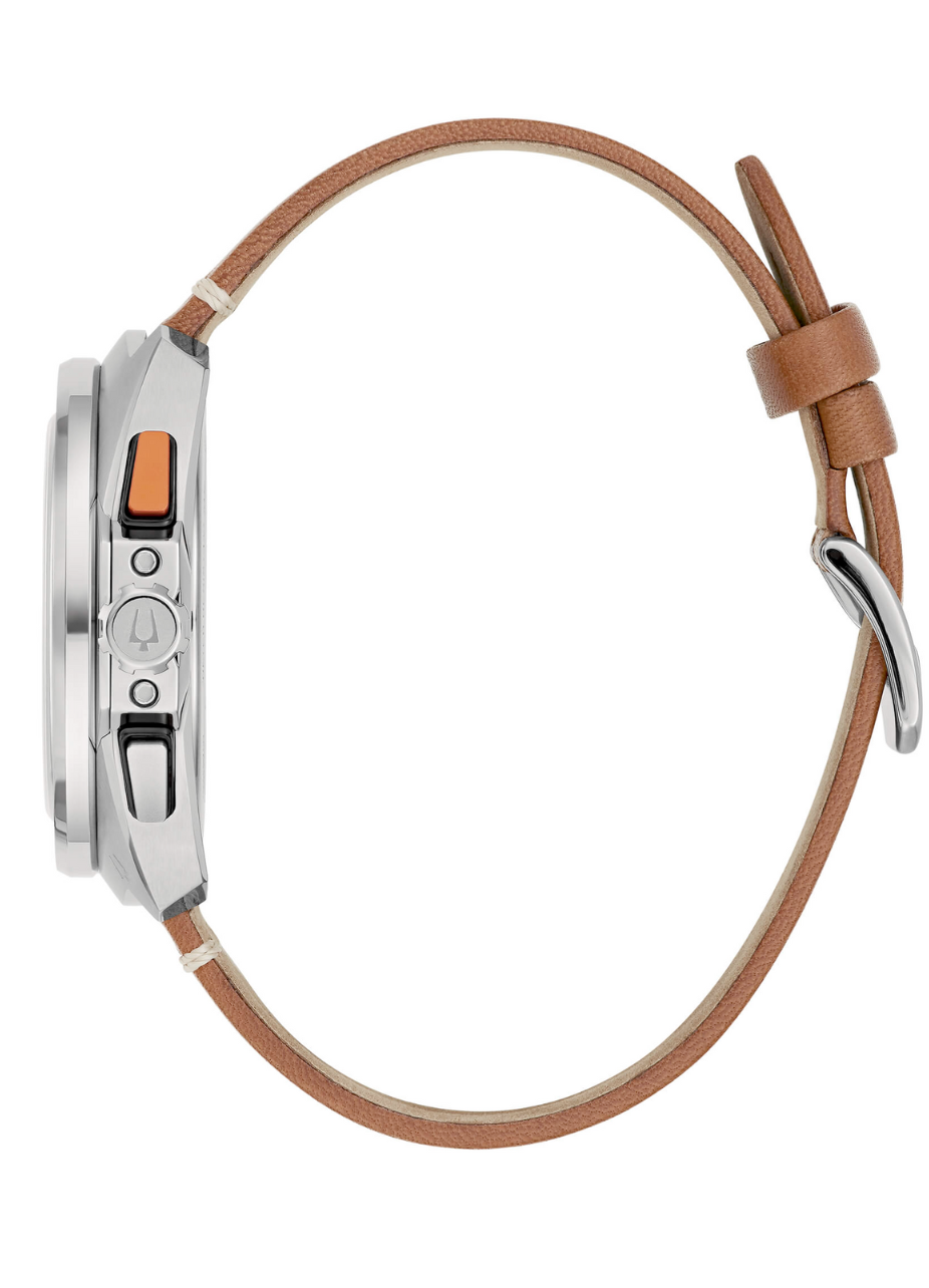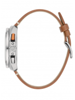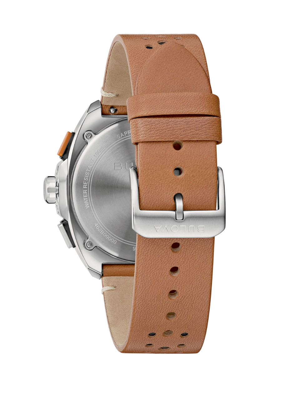 Dotato di un movimento al quarzo di precisione con funzione cronografo, l'orologio è protetto da un vetro zaffiro piatto, quasi immune ai graffi. La cassa in acciaio inossidabile da 42 mm si abbina perfettamente al cinturino in pelle marrone traforata in stile racing, offrendo comfort e un look vintage-sportivo. Con una resistenza all'acqua di 10 Bar (100 metri), è pronto ad affrontare ogni tua avventura, in pista e fuori.
