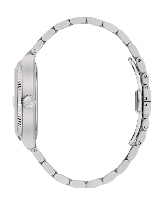 La cassa da 38 mm in acciaio inossidabile presenta una lunetta scanalata che ne esalta la lucentezza. Il punto focale è il quadrante blu con finitura sunray, protetto da un robusto vetro zaffiro, garantendo una resistenza superiore ai graffi. Il bracciale a cinque maglie in acciaio completa il look, offrendo un comfort e un'eleganza senza tempo.