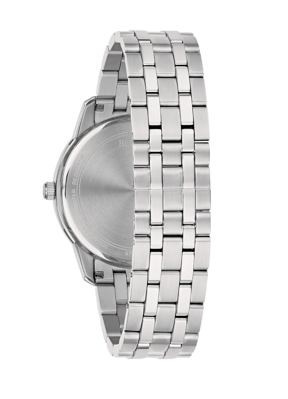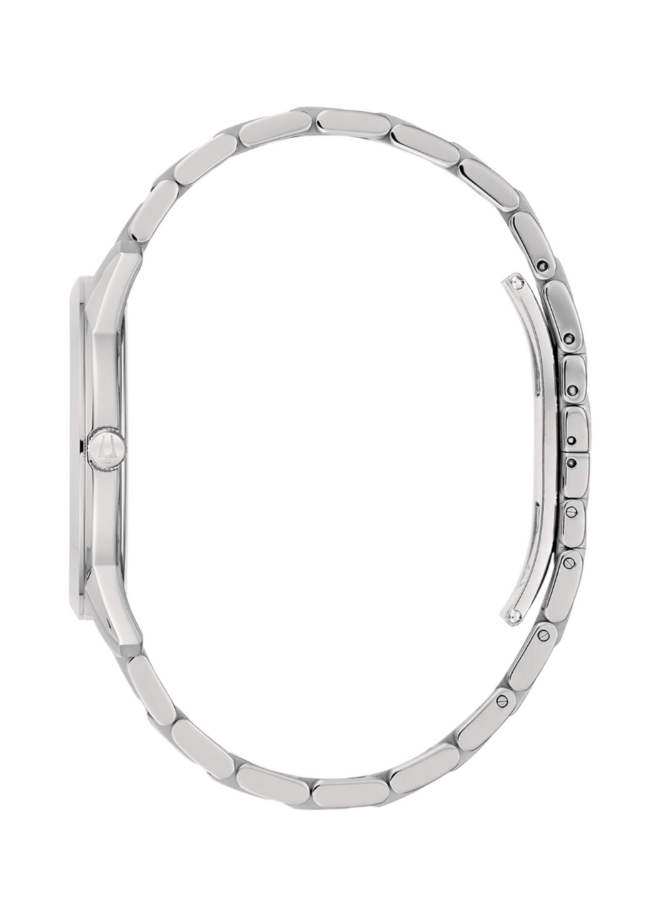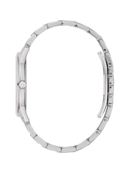 Il bracciale in maglia d'acciaio con chiusura deployante non solo assicura una vestibilità sicura e confortevole, ma conferisce anche all'orologio un aspetto coeso e lussuoso. Con uno spessore contenuto di circa 7-8 mm, il 96B338 scivola con facilità sotto il polsino della camicia, rendendolo il compagno ideale per gli impegni quotidiani e le serate eleganti.