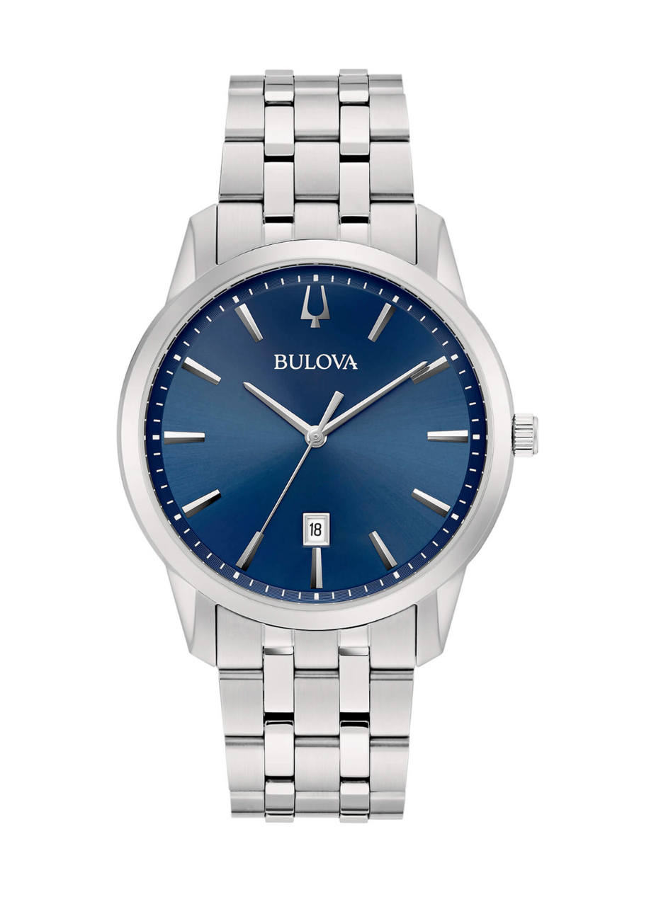 La cassa rotonda da 40 mm in acciaio inossidabile ospita un ipnotico quadrante blu Sunray, la cui finitura a raggio di sole cattura la luce in modo dinamico, creando un effetto visivo profondo e sofisticato. Gli indici a bastone in acciaio lucido e la finestra del datario posizionata a ore 6 completano il look minimalista ed estremamente leggibile.