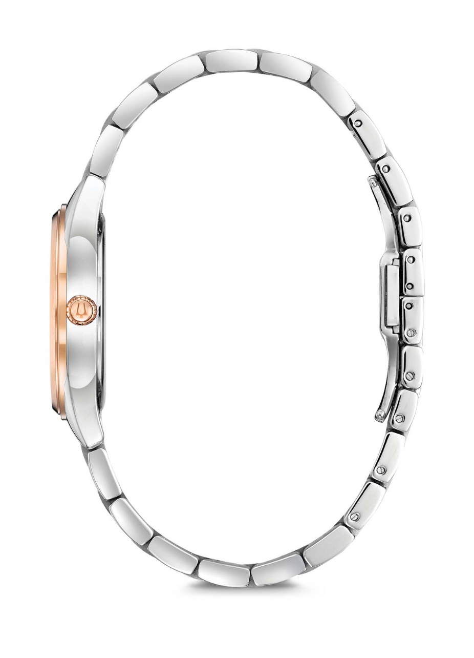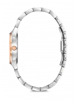 L'eleganza è definita dalla cassa rotonda da 32 mm e dal bracciale in acciaio inossidabile bicolore (Argento e PVD Oro Rosa). Il punto focale è il quadrante in Madreperla bianca, impreziosito da otto diamanti naturali che sostituiscono gli indici, conferendo un tocco di brillantezza a ogni movimento. Gli indici a bastone e le lancette in color oro rosa si abbinano perfettamente alla placcatura della cassa e del bracciale.