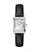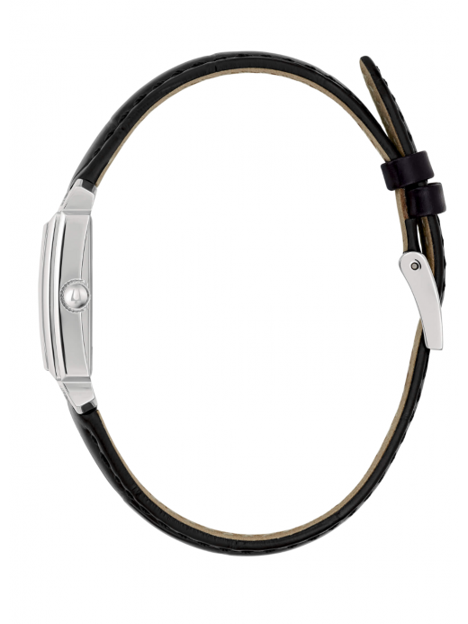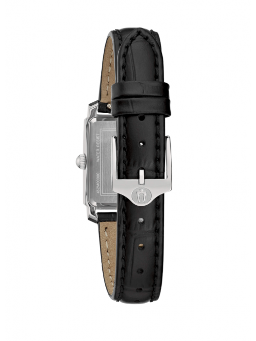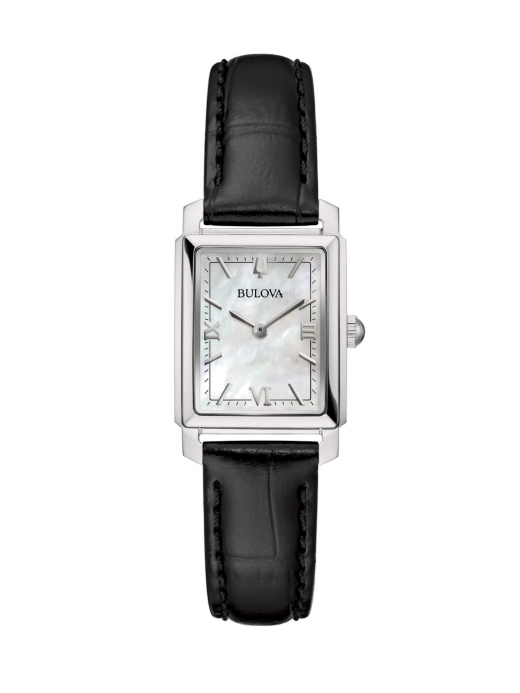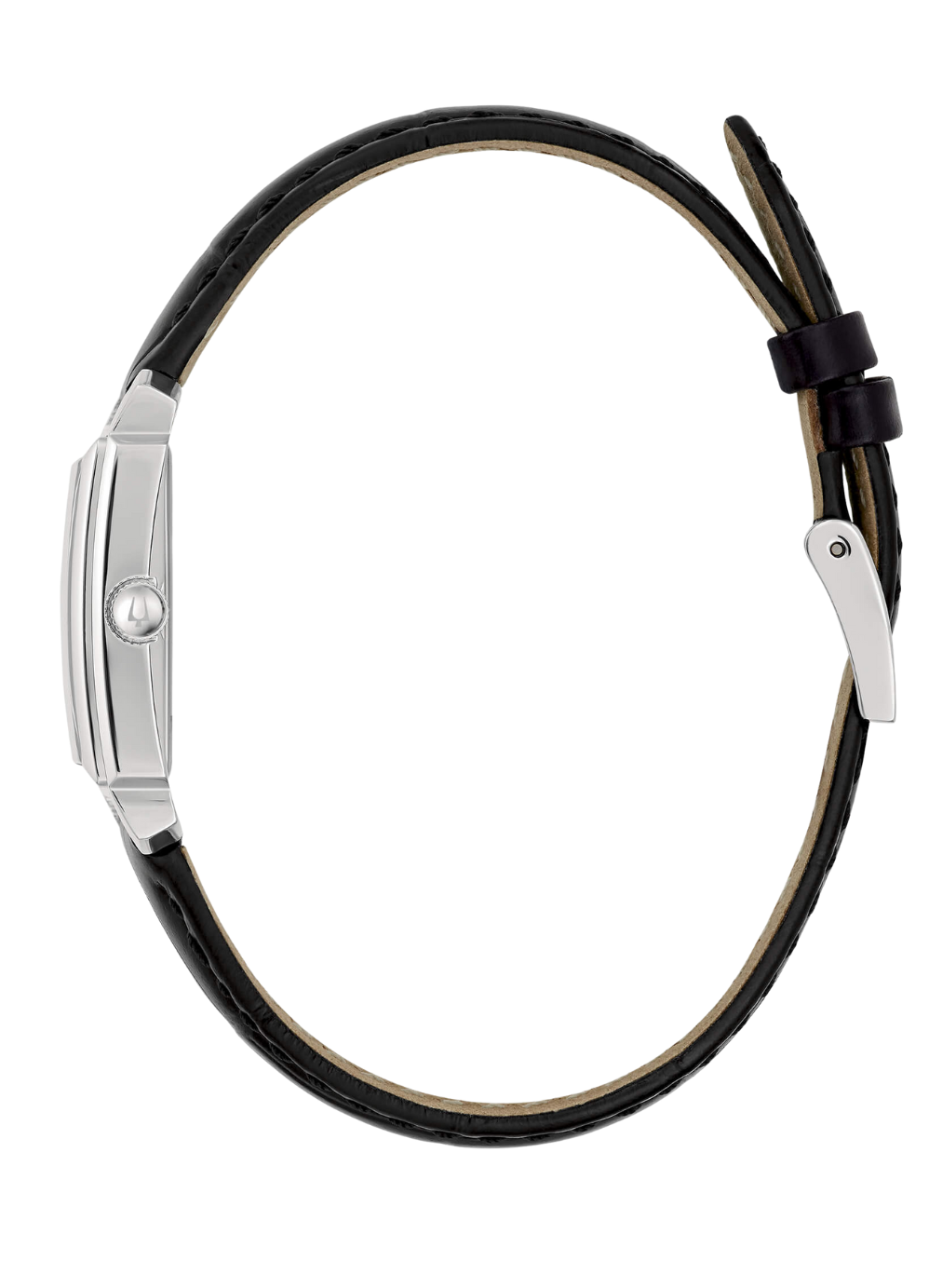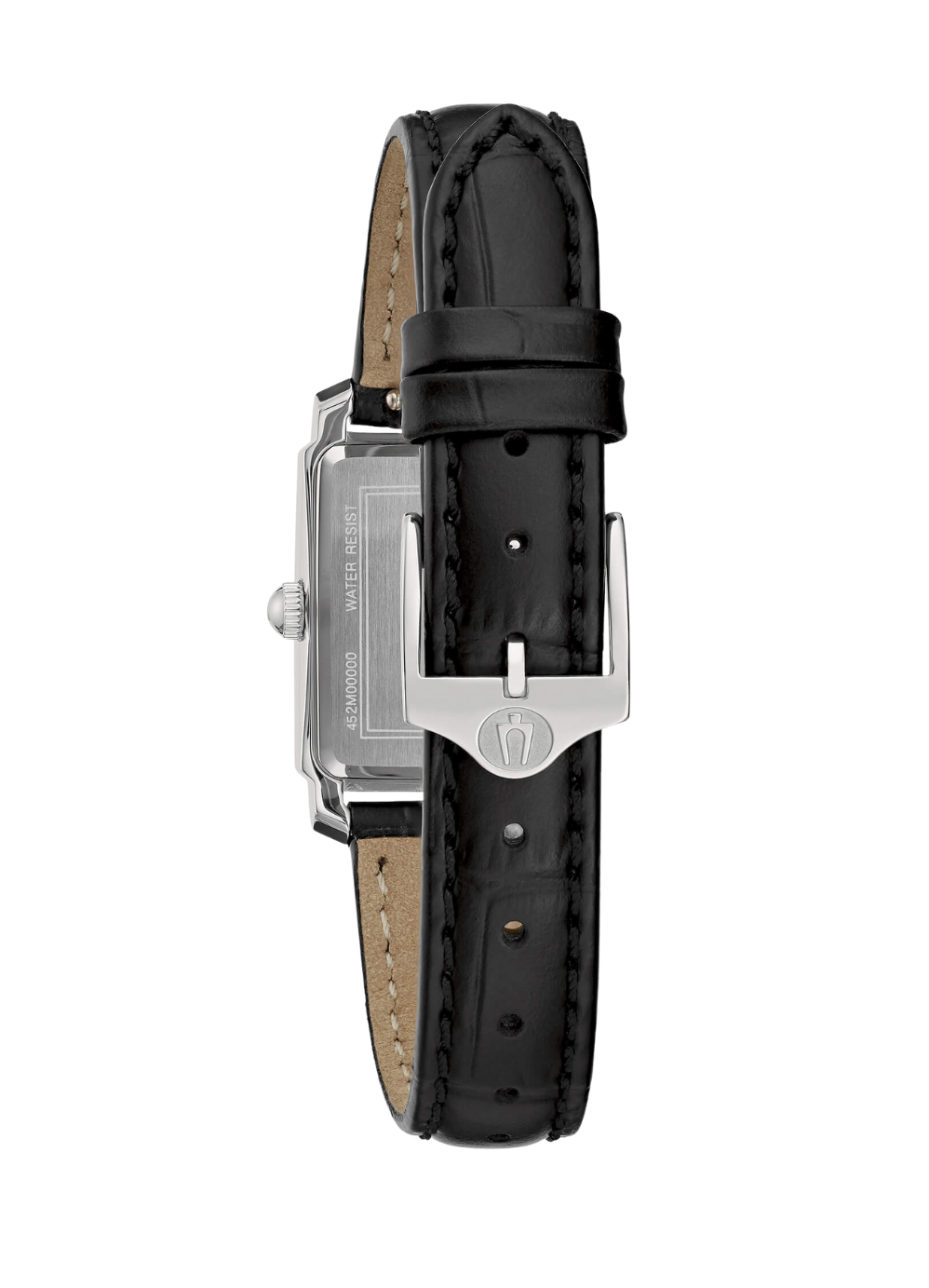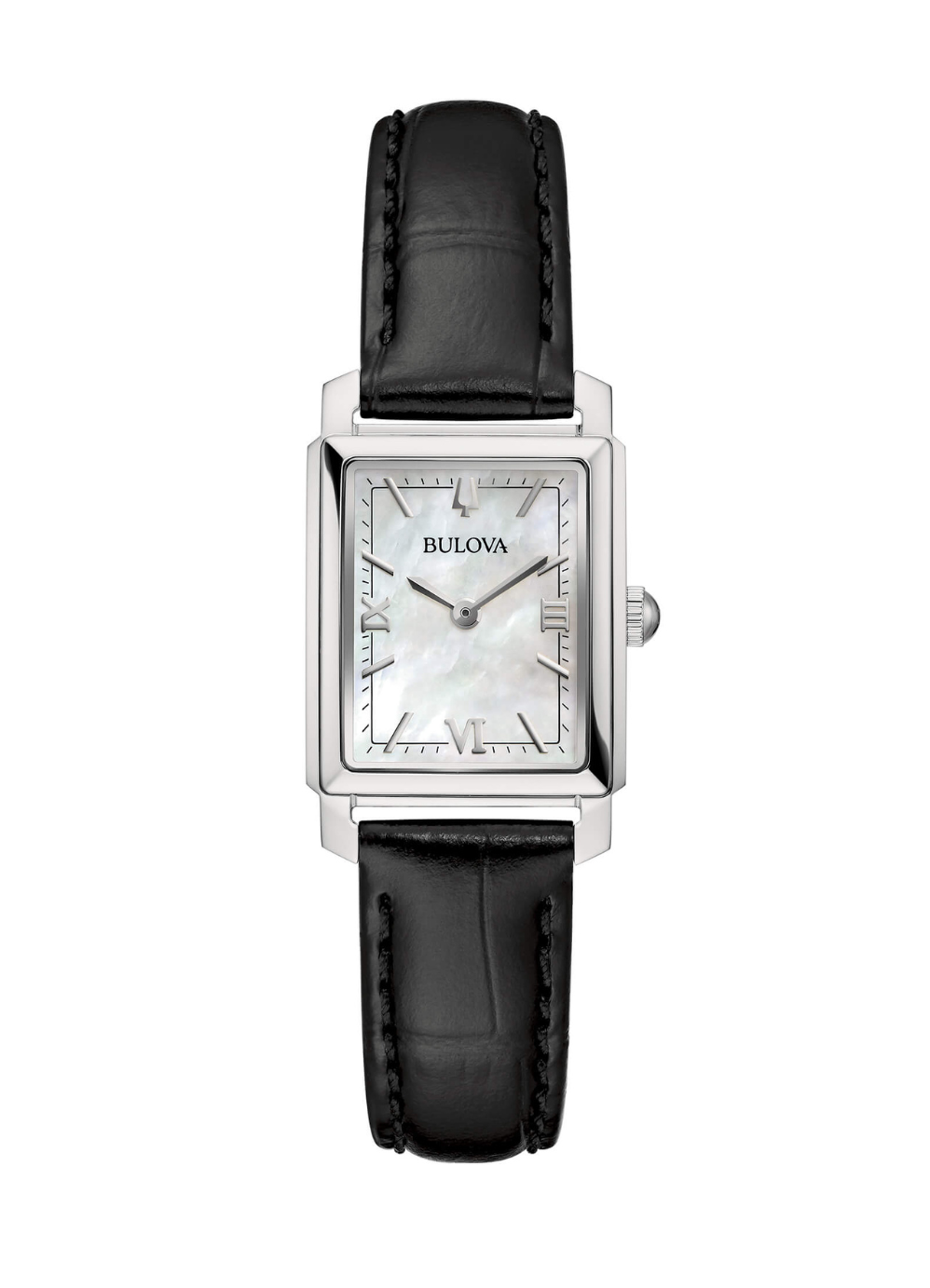 La cassa rettangolare (circa 21 x 32,5 mm) in acciaio inossidabile con finitura lucida è abbinata a un elegante cinturino in pelle nera con stampa coccodrillo. Alimentato da un affidabile movimento al quarzo (Miyota GL22), il 96L330 offre un'elevata precisione. Il vetro minerale leggermente curvo protegge il quadrante, completando un design ideale per un look da ufficio o una serata elegante.