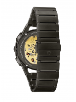 La cassa da 44 mm in acciaio inossidabile presenta una finitura in PVD Gunmetal (VP GREY), creando un look total black sofisticato e audace. Il quadrante Antracite scheletrato è arricchito da dettagli in PVD oro giallo e ospita i contatori del cronografo.