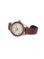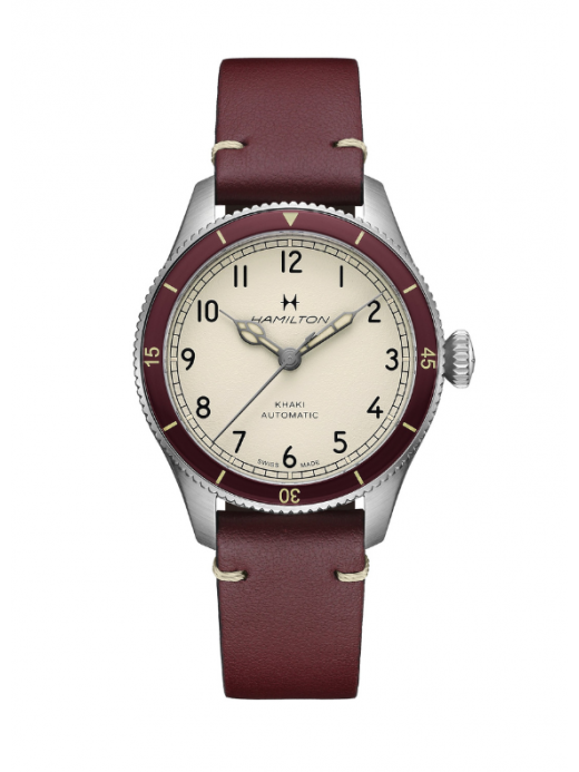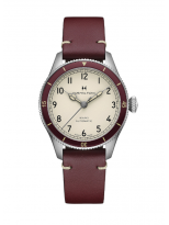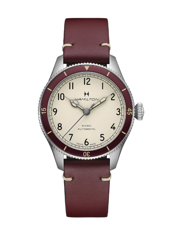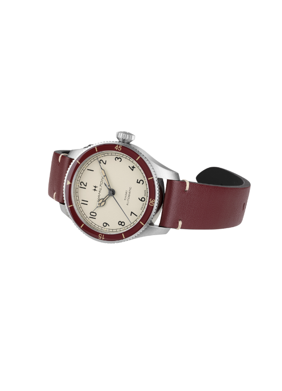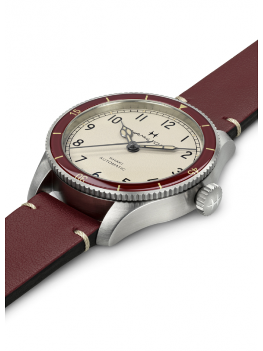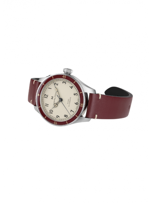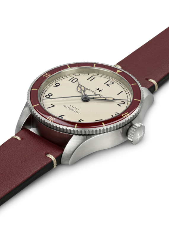 Il cuore dell’orologio è il movimento automatico Calibro H-10 dotato di spirale in Nivachron™, con una formidabile riserva di carica di circa 80 ore. La chiusura del fondello trasparente a vite consente di ammirare il meccanismo, mentre la resistenza all’acqua fino a 10 bar (100 metri / 330 piedi) garantisce affidabilità anche in contesti attivi. Il cinturino in pelle bordeaux, con ansa da 18 mm, completa il look sofisticato-strumentale. Un modello perfetto per il polso di chi apprezza un orologio compatto, tecnico e con forte identità.