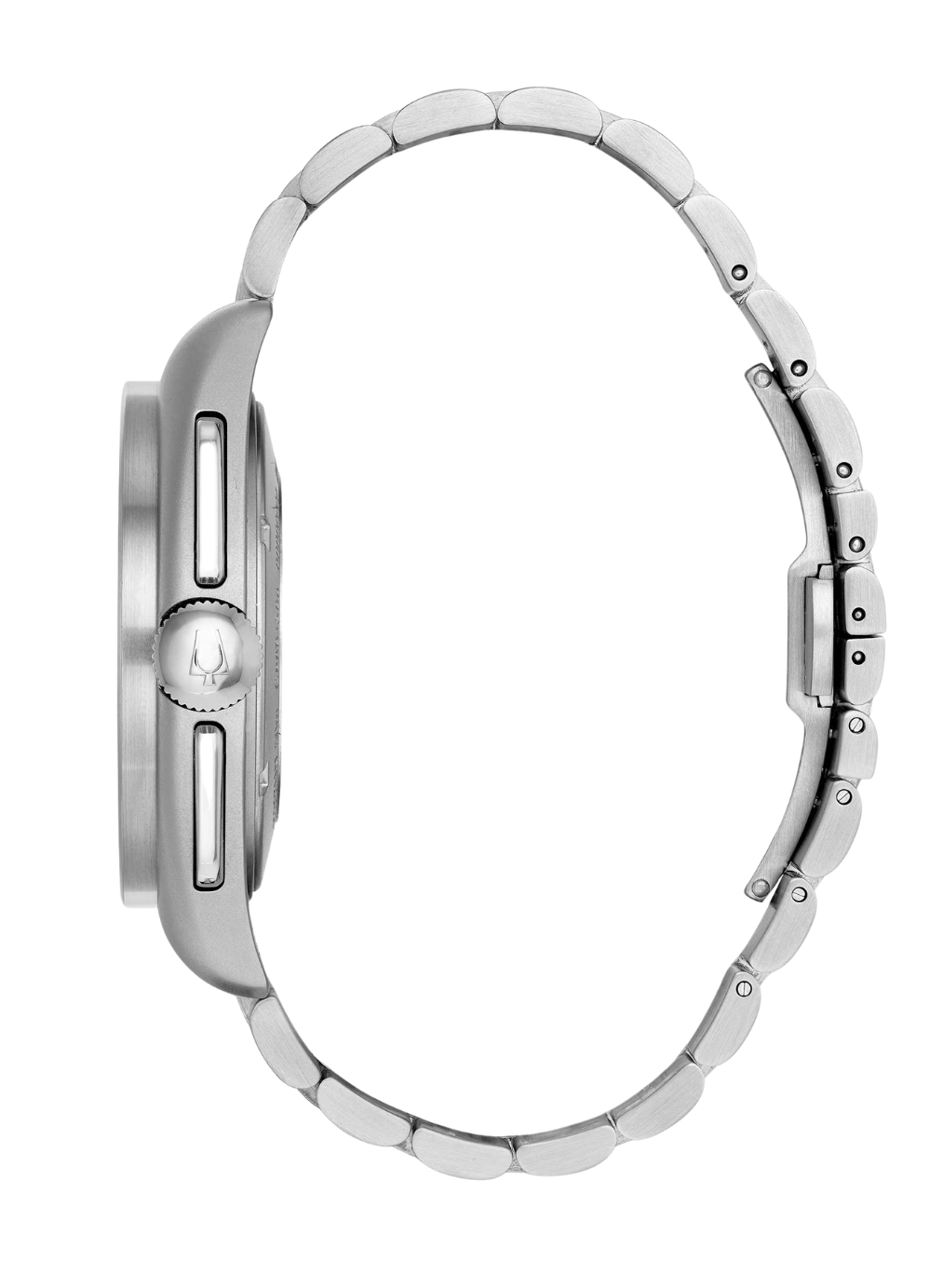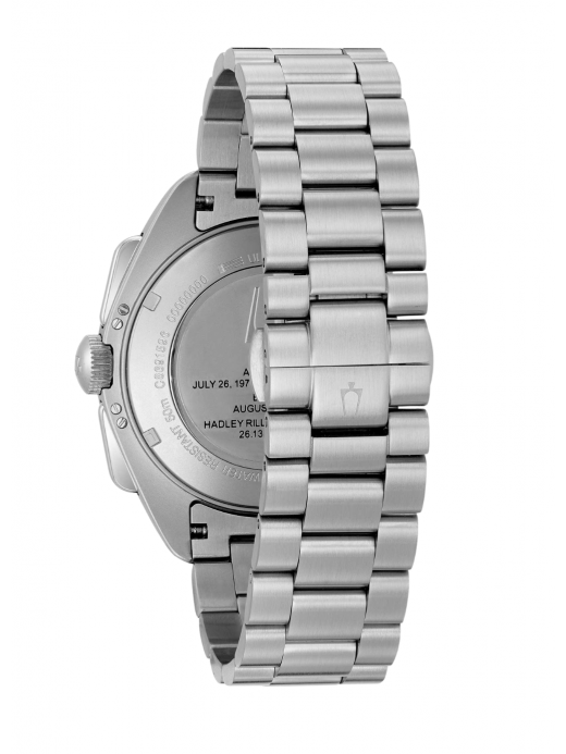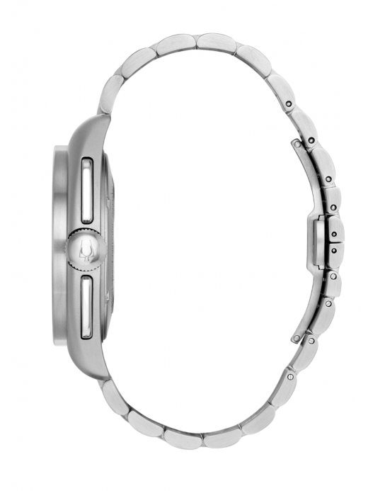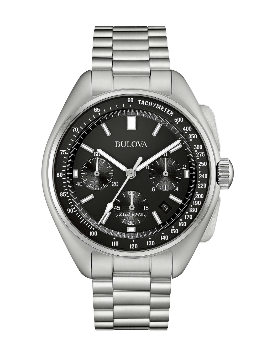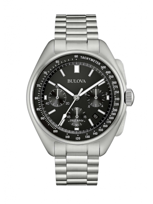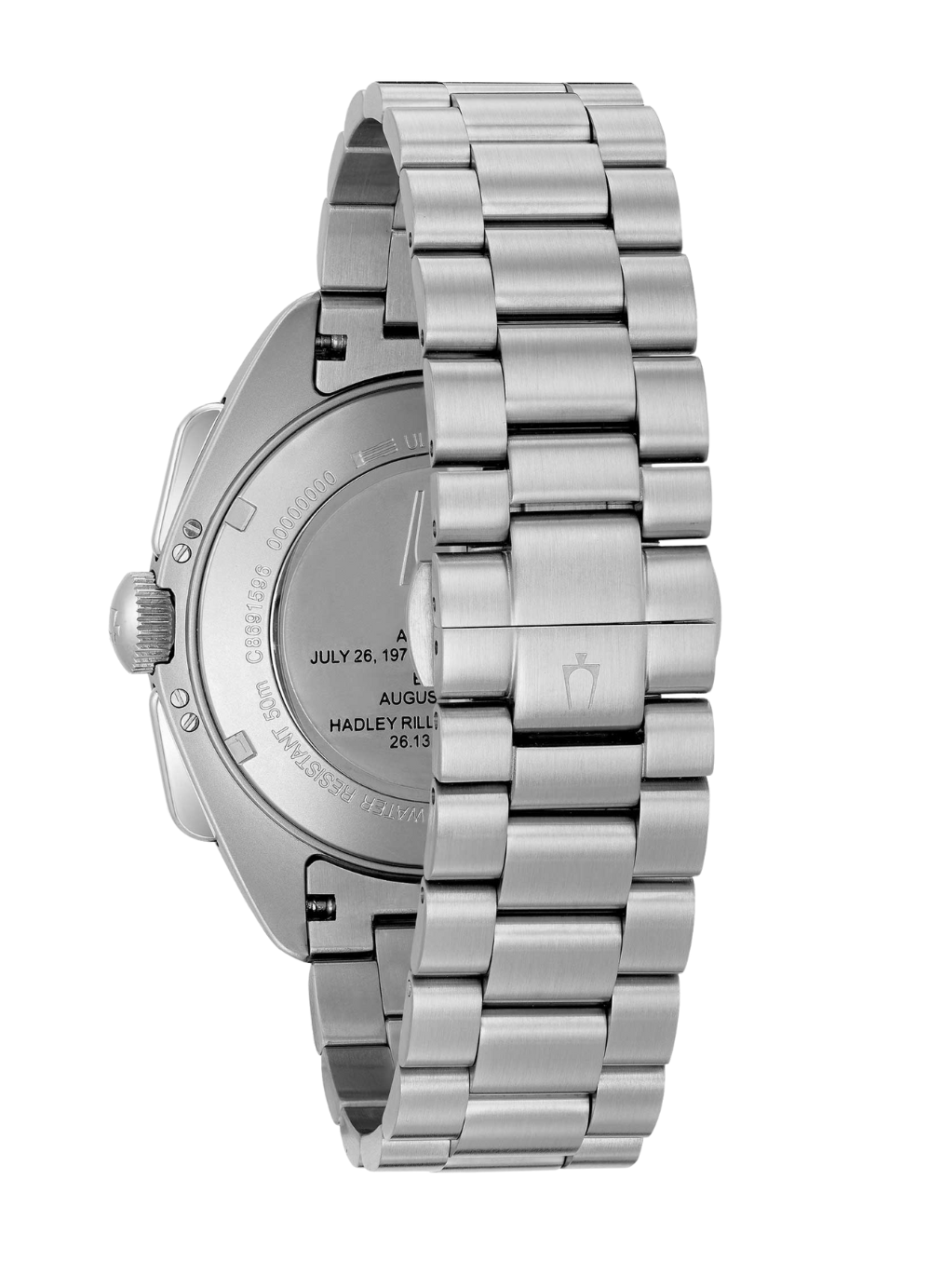 Questo modello si distingue per il suo bracciale in acciaio inossidabile con chiusura deployante, che conferisce un aspetto più raffinato e robusto rispetto alle versioni con cinturino, mantenendo viva la funzionalità cronografica e l'eredità storica del Bulova Lunar Pilot.