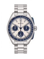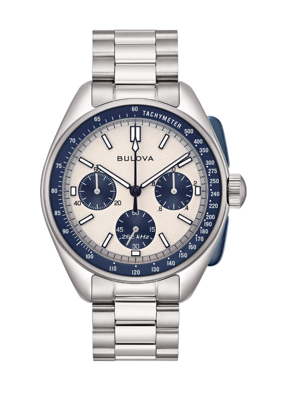 Il Bulova Lunar Pilot 98A305 è una rivisitazione del leggendario cronografo che ha accompagnato l'uomo sulla Luna nel 1971, riproposto in una cassa da 43.5 mm, più sottile e confortevole. Questo modello si distingue per il suo accattivante quadrante "Panda" (fondo bianco con sub-quadranti a contrasto) arricchito da dettagli e lancette cronografiche di un elegante colore blu, che lo rendono immediatamente riconoscibile.