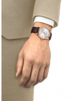 La cassa da 39 mm è rivestita con un lussuoso trattamento PVD color Oro Rosa, che offre un contrasto sofisticato con il brillante quadrante silver (argento). Il quadrante è impreziosito dal delicato motivo a clous de Paris e da indici semplici. Il cinturino in pelle bovina marrone aggiunge un tocco di eleganza discreta.