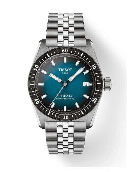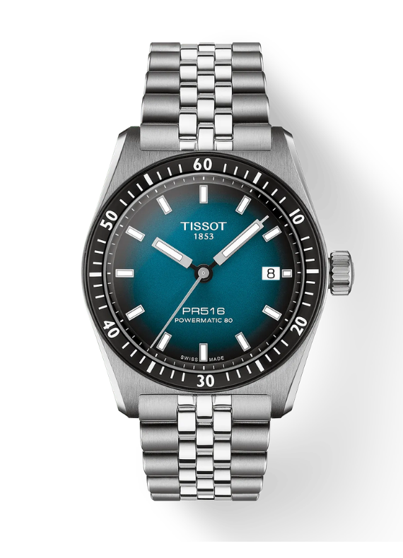 L'orologio Tissot PR516 Powermatic 80 reinterpreta magistralmente l'iconico spirito sportivo degli anni '70, dando vita a un segnatempo moderno e dalle prestazioni eccezionali. Il cuore del design è la sua compatta cassa in acciaio inossidabile da 38 mm, impreziosita da una distintiva ghiera con anello in PVD nero. Il vero protagonista è però il magnetico quadrante blu sfumato verso il nero, dotato di lancette e indici a bastone trattati con Super-LumiNova® per garantire una visibilità impeccabile in qualsiasi condizione di luce.