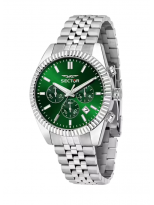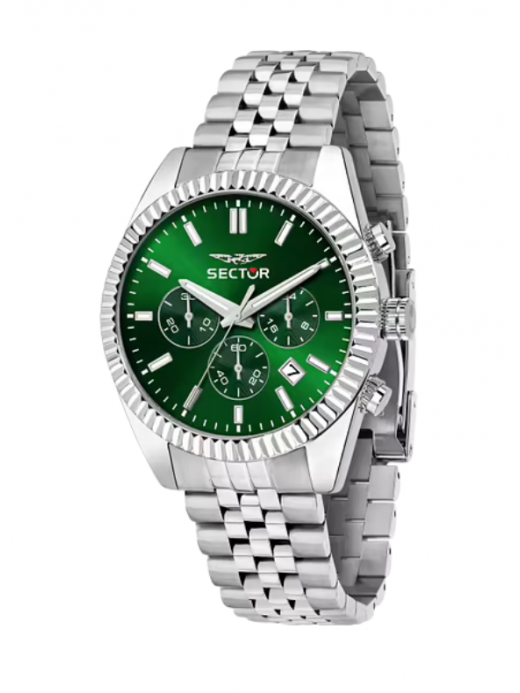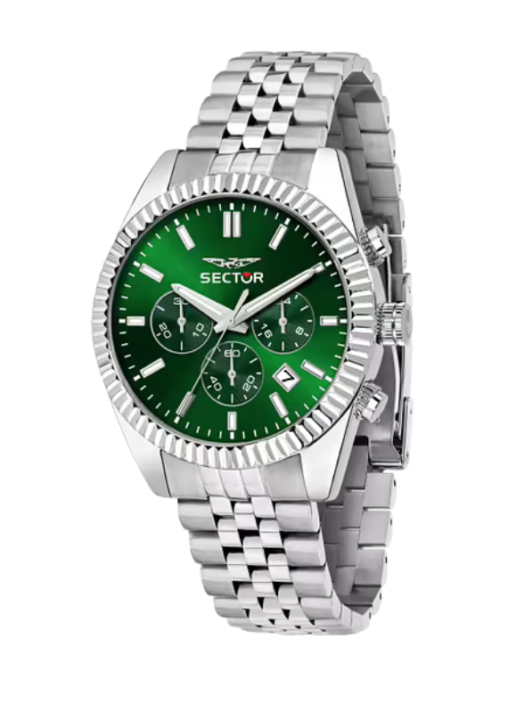Il Sector 240 R3273640004 è un cronografo da uomo della collezione 240, caratterizzato da uno stile sportivo‑elegante e prestazioni affidabili per l’uso quotidiano. Monta movimento al quarzo analogico con funzioni cronografiche e datario, garantendo precisione e praticità. La cassa in acciaio inox da 41 mm accoglie un quadrante verde smeraldo con indici ben leggibili e datario tra le ore 4 e 5, il tutto protetto da vetro minerale resistente ai graffi. Il bracciale in acciaio inox silver con chiusura diver con blocco di sicurezza assicura comfort e stabilità al polso. Con resistenza all’acqua fino a 5 ATM (50 m / 165 ft) è perfetto per l’uso quotidiano anche in condizioni di umidità o contatto con acqua leggera. Questo cronografo combina design moderno e funzionalità tecniche per l’uomo dinamico.