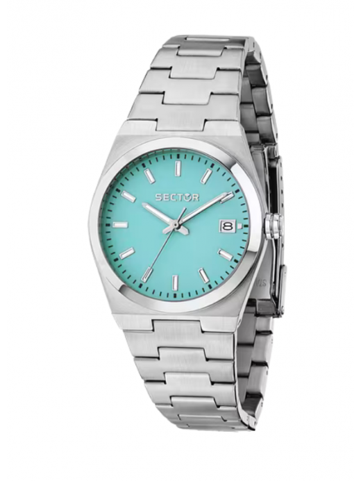 Il Sector C300 R3253301503 è un elegante orologio solo tempo da donna caratterizzato da un design raffinato e moderno, perfetto per il polso femminile. Dotato di movimento al quarzo analogico preciso, questo segnatempo visualizza ore, minuti e datario in modo chiaro ed essenziale. La cassa in acciaio inox da 34 mm con finitura lucida si abbina armoniosamente a un bracciale in acciaio silver con chiusura diver dotata di blocco di sicurezza, garantendo comfort e solidità. Il quadrante turchese (turquoise) conferisce un tocco di colore distintivo, protetto da vetro minerale resistente ai graffi quotidiani. Con resistenza all’acqua fino a 5 ATM (50 m / 165 ft) è adatto per l’uso quotidiano anche in condizioni di umidità o pioggia leggera.