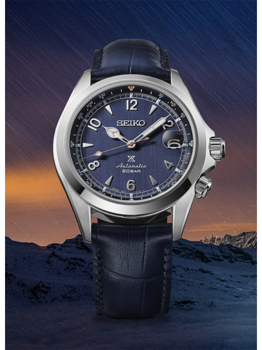 La cassa da 39.5 mm in acciaio inossidabile è robusta e resistente, tipica della linea Prospex. Il quadrante blu intenso con una sottile struttura verticale rievoca le notti stellate in alta montagna, un dettaglio visivo di grande fascino. L'orologio include la funzione GMT grazie al Calibro 6R54 automatico, con una lunga riserva di carica di 72 ore.