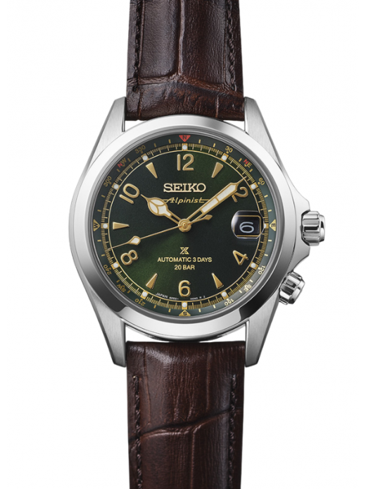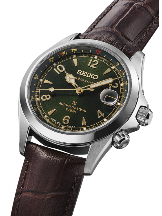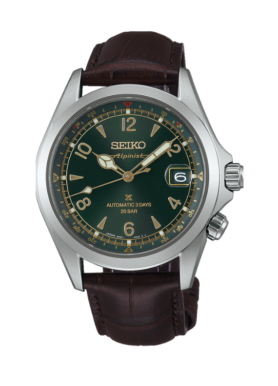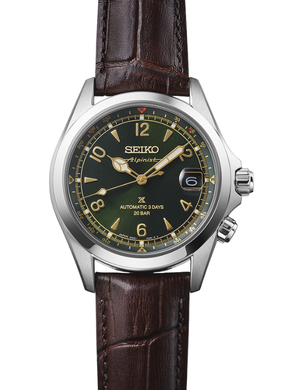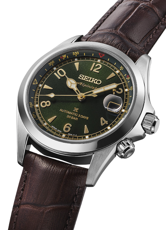 Il quadrante verde intenso richiama i paesaggi alpini, e viene affiancato da lancette e indici LumiBrite® per una leggibilità eccellente. Il vetro è zaffiro con lente di ingrandimento sulla data, fondello a vite trasparente e lunetta interna girevole con bussola completano il carattere tecnico. Impermeabilità dichiarata fino a 20 bar (200 metri / ~660 piedi).