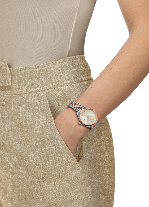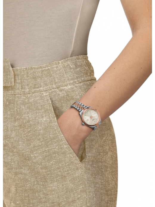 Il Tissot Ballade 34 mm esprime un’eleganza senza tempo grazie alla raffinata combinazione di acciaio e finiture dorate, ideale per chi desidera un segnatempo sofisticato e versatile.