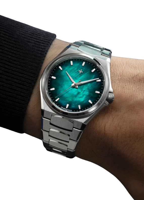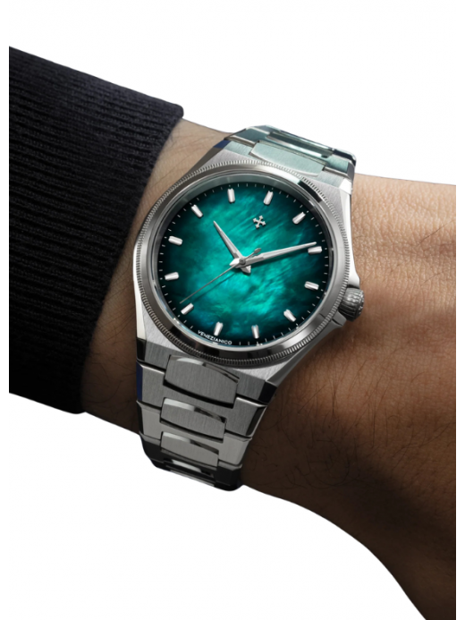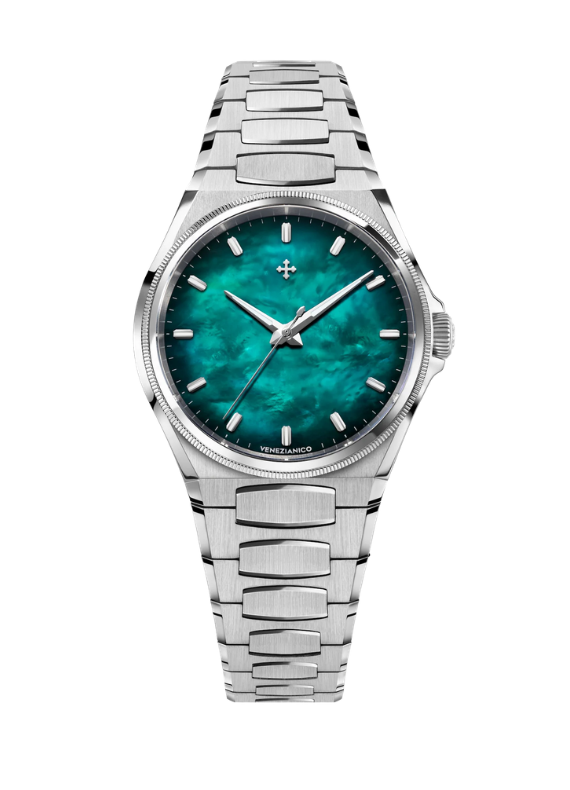 Il design di questo segnatempo trae ispirazione dall'Arsenale di Venezia, l'antico cantiere navale che ha rappresentato per secoli il cuore dell'innovazione tecnologica della Serenissima. Arsenale combina finiture classiche con un design audace e moderno, creando un perfetto equilibrio tra tradizione e innovazione. La sua cassa spessa solamente 9mm e il bracciale integrato, caratterizzato da maglie satinate e dettagli lucidi, lo rendono un modello elegante e contemporaneo.