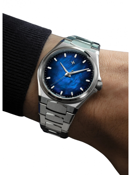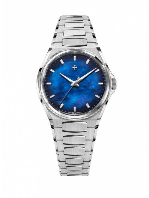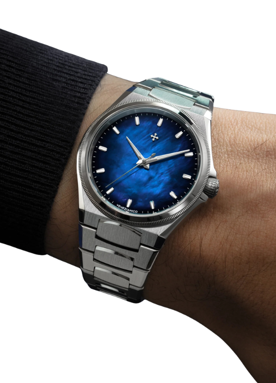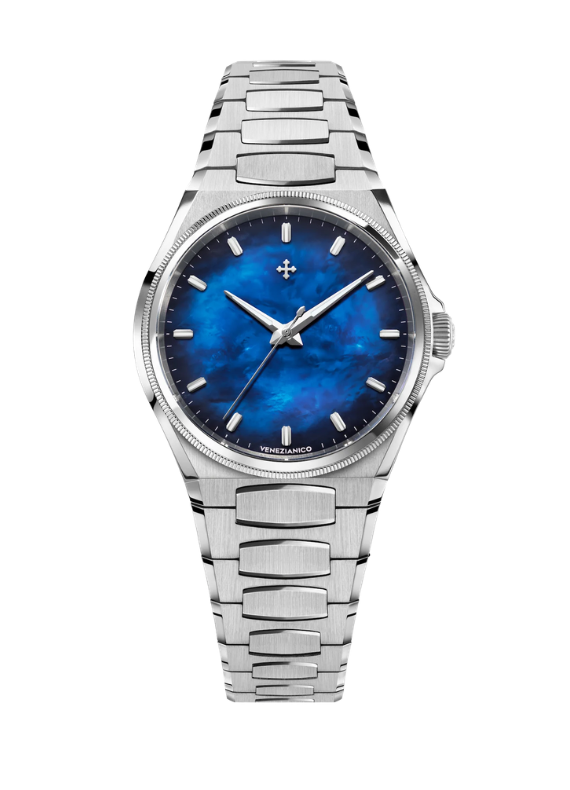 Il design di questo segnatempo trae ispirazione dall'Arsenale di Venezia, l'antico cantiere navale che ha rappresentato per secoli il cuore dell'innovazione tecnologica della Serenissima. Arsenale combina finiture classiche con un design audace e moderno, creando un perfetto equilibrio tra tradizione e innovazione. La sua cassa spessa solamente 9mm e il bracciale integrato, caratterizzato da maglie satinate e dettagli lucidi, lo rendono un modello elegante e contemporaneo.