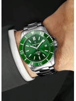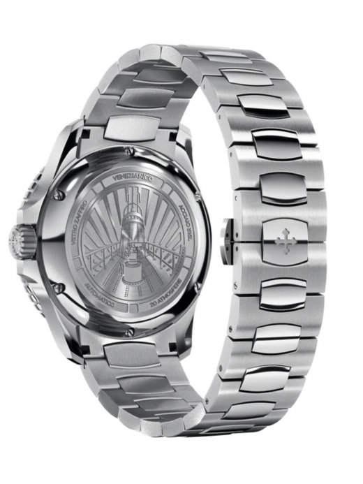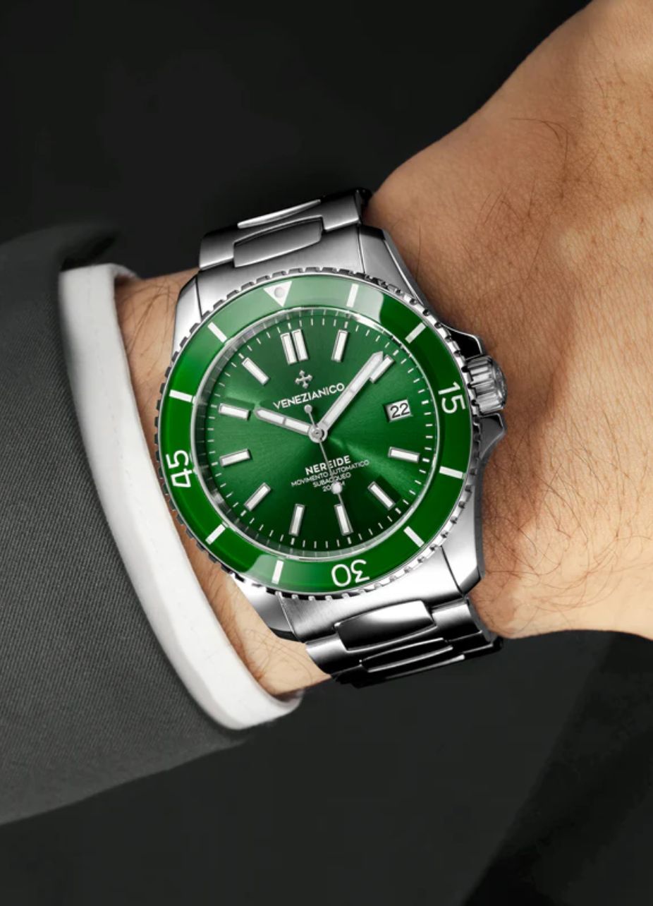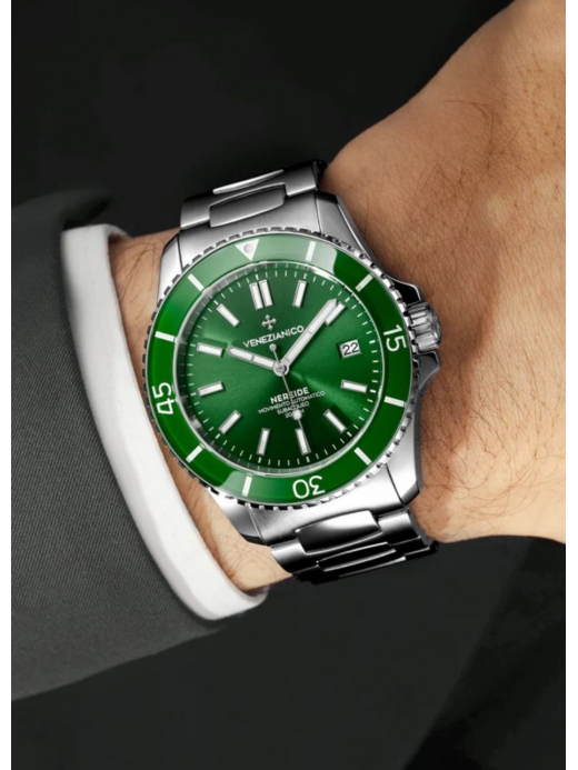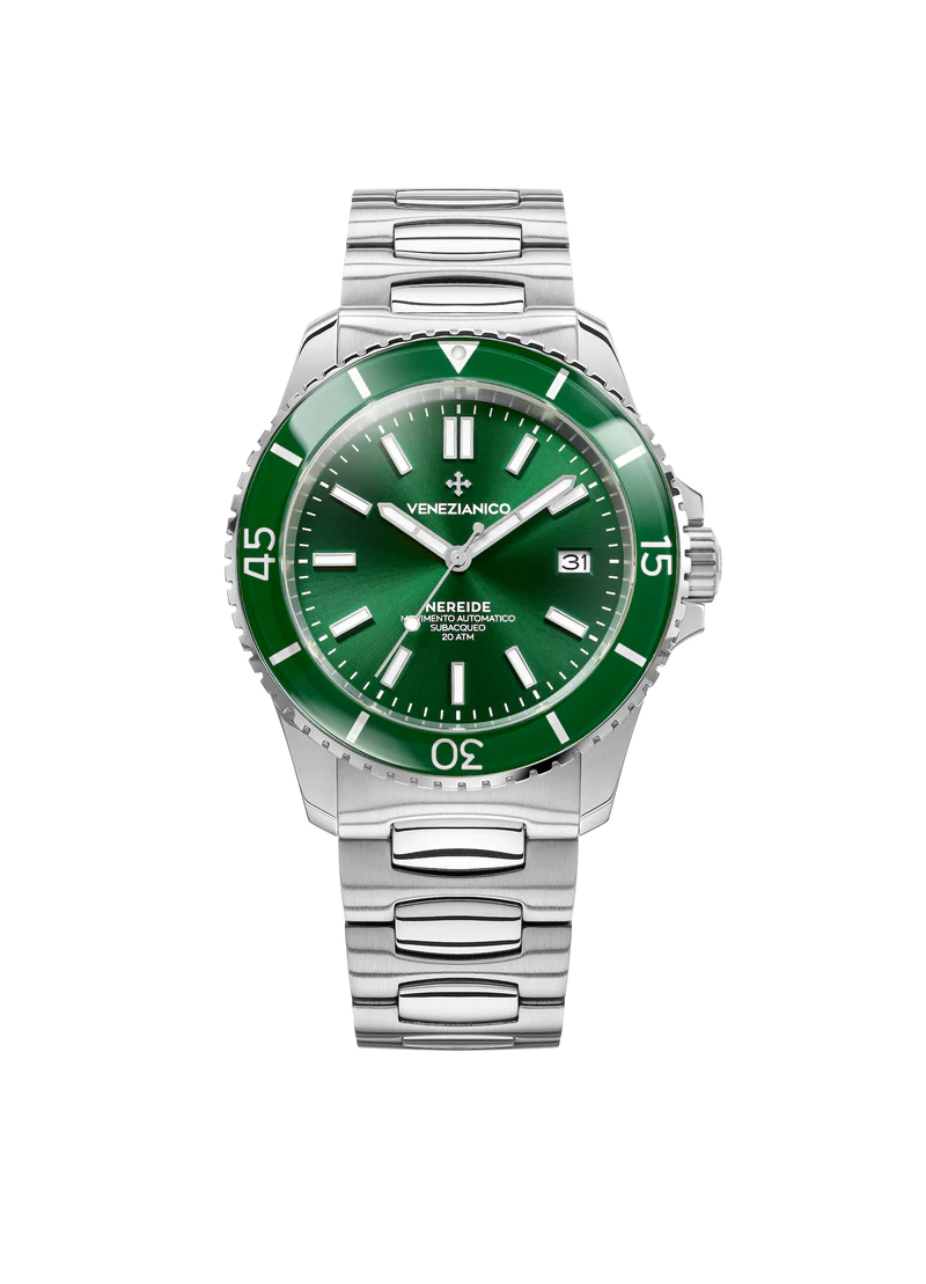 Il Venezianico Nereide 42 (Ref. 3321501C) è un segnatempo che incarna lo spirito pionieristico del sommergibile veneziano da cui trae il nome. Questo diver professionale si distingue per un magnetico quadrante verde smeraldo con finitura soleil, capace di creare giochi di luce profondi e dinamici ad ogni movimento del polso.